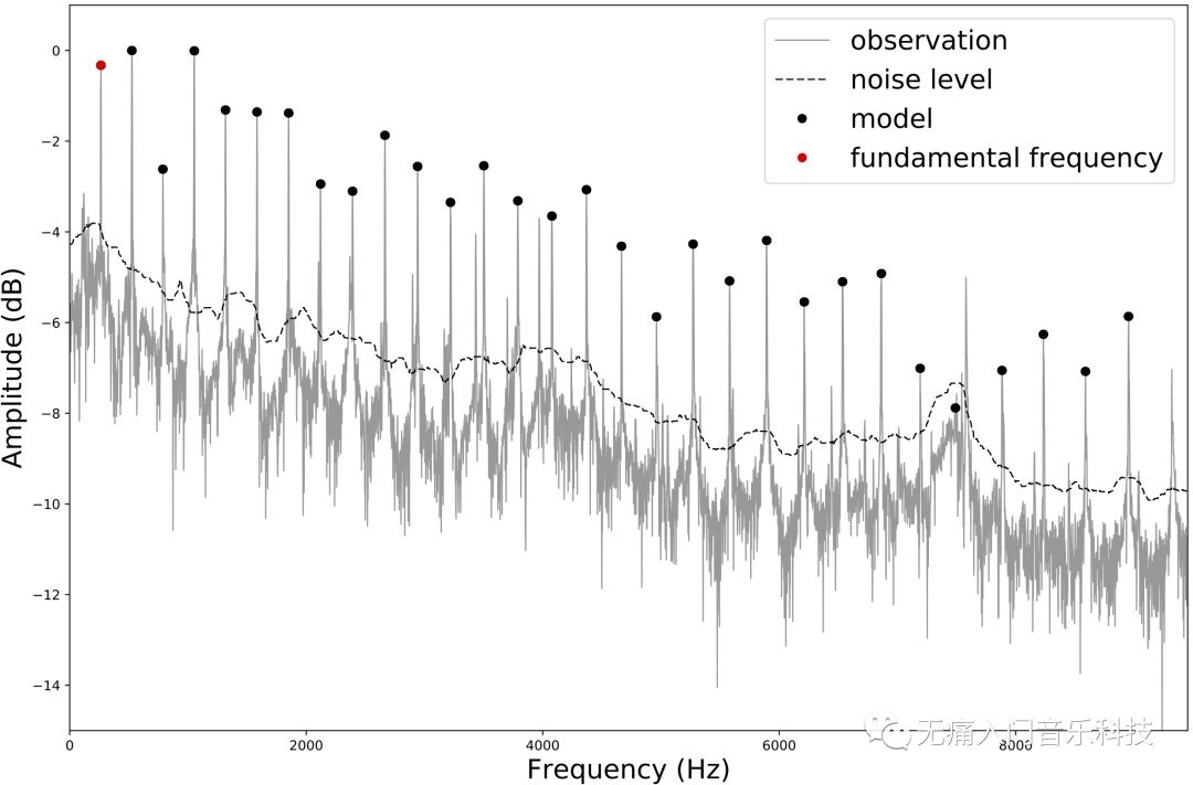 理想情况下,泛音和基音之间的频率值应该是整数倍的关系,由于钢琴本身的物理特性,第n个泛音和基音之间关系其实是