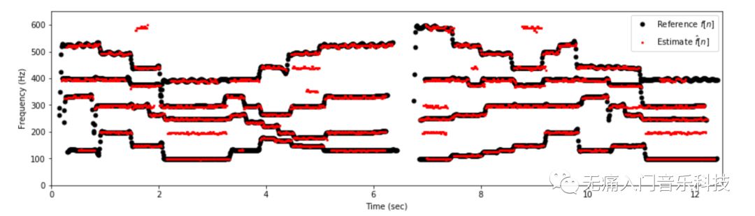 3.最后从salience中解析出每一帧内有哪些音高,得到类似下图的结果(黑色为标准答案,红色为算法估计结果)。
