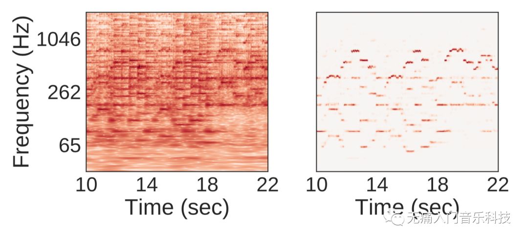 2.利用基于不同识别方法的模型与优化,得到强调乐音部分并抑制其他干扰项的“突显”时频谱(salience representation),如下方右图。