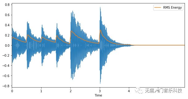 比如上段提到的能量包络,可以通过计算均方根能量得到。我们仍用MIR-01博文中的音频为例,代码及图像如下: