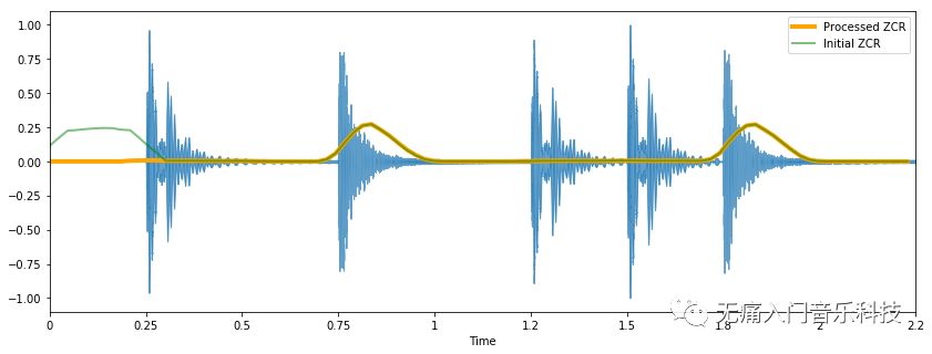 ✎ 音频最开始的“无声”区域,其实是有许多非常小数值的样本在界限0的周围转悠,所以也得到了较高的过零率。我们可以先给整个音频样本的数值都加个小小的常数,消除这些小数值对过零率计算的影响: