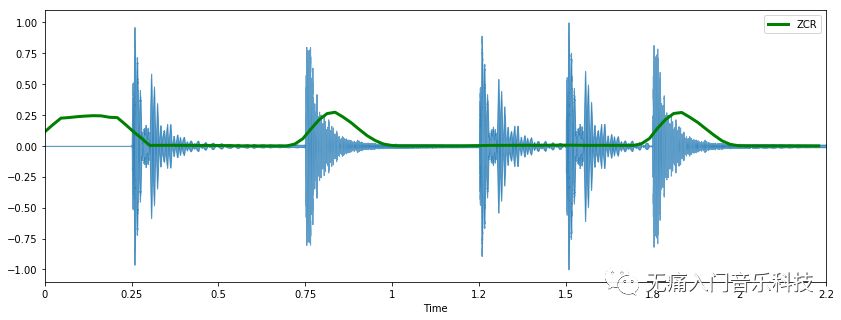 针对于整个音频数据,以2048个样本为一帧,计算该帧下过零率,再跳过512个样本继续计算下一帧内的过零率: