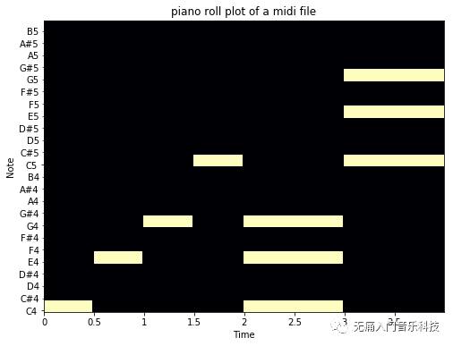 我们也可以用把上面的结果画成piano roll的样子,这也是MIDI在各种DAW中所呈现的模样。