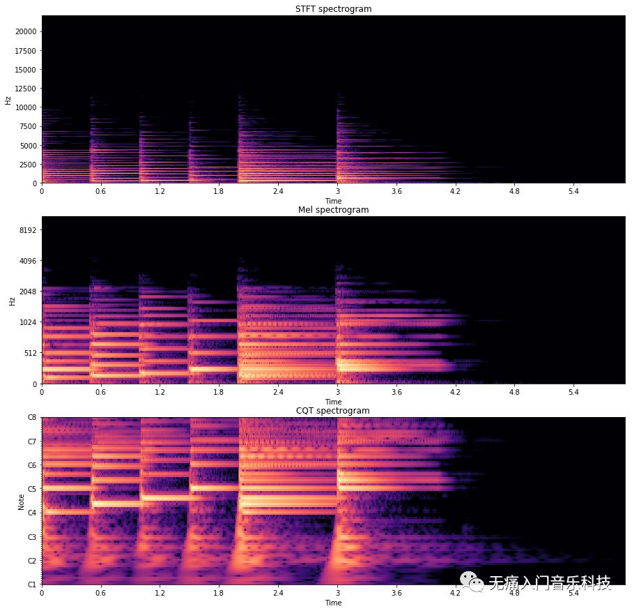 我们用下面的代码对比看下同一段音乐的不同频谱图: