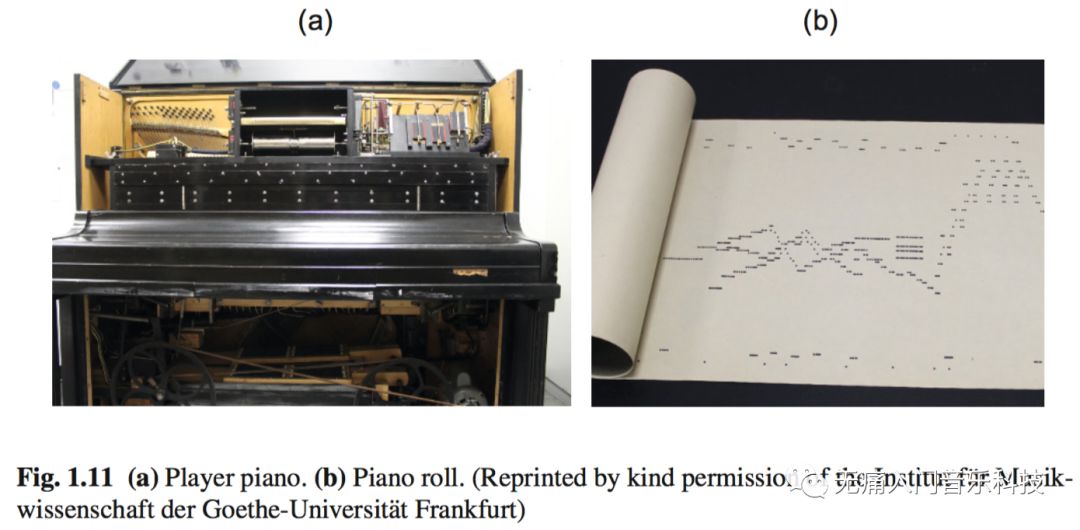与其将symbolic representation翻译成符号化格式,不如比喻成“机械眼中的乐谱”。这种格式最早可以追溯到19世纪末的欧洲,也就是自动演奏钢琴(player piano)被发明的时候,这种钢琴用“木手指”代替演奏者的双手,通过缓缓转动纸卷并读取上面被打孔的位置,可驱动“木手指”击琴键奏出音乐。这种纸卷即piano roll就是最原始的符号化格式,许多钢琴家也曾用它记录自己如何弹得一手好琴。