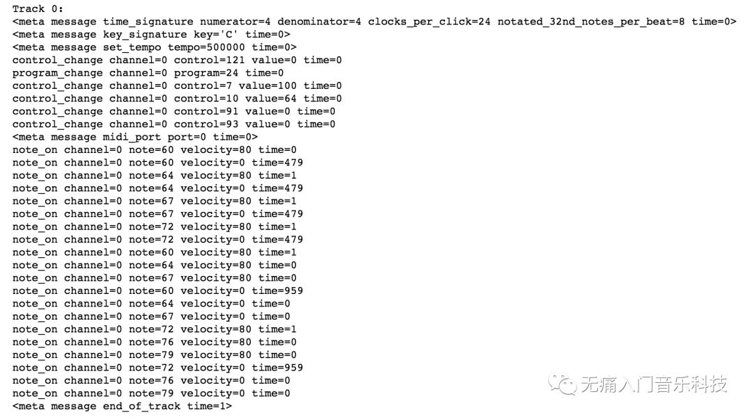 下方代码可以将示例音乐片段对应的MIDI文件“打印”出来,可见MIDI格式的本质是遵循着一个标准技术规格(MIDI 1.0)将所有音乐中涉及的元素编码成数字数据的结构。该标准也声明了硬件和软件之间传输MIDI的协议,方便MIDI在各种合成器(synthesizer)和数字音乐工作站(DAW)之间被广泛使用。