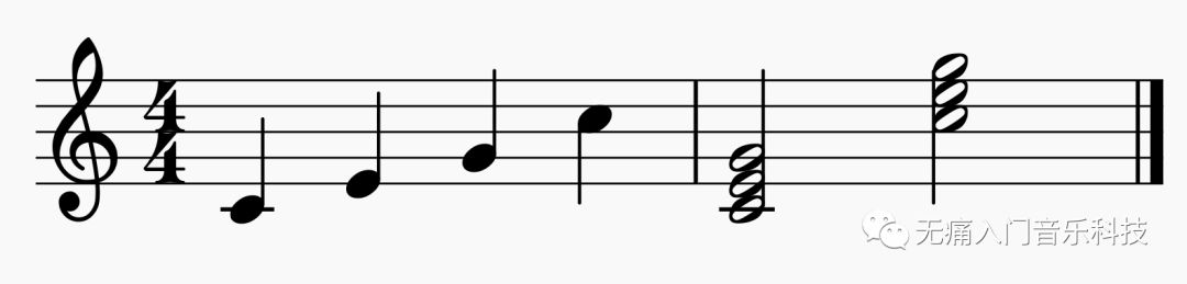 从五线谱中可知,我们以“四分音符为一拍,每小节有四拍”的基本节奏型,在第一小节的四拍上分别演奏了 C4 E4 G4 C5,在第二小节的前两拍和后两拍分别演奏了在不同音区的C和弦 Cmaj,当前的调性是C大调。