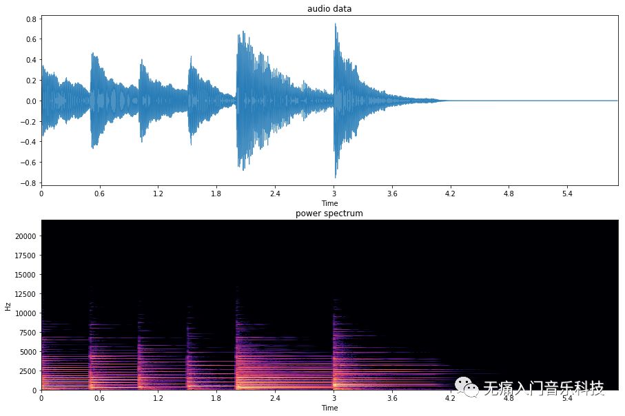 对于计算机来说,面对的是自然界连续信号采样后的离散信号,所以做的是离散傅里叶变换(DFT)或者“加速版”即快速傅里叶变换(FFT),这两者只会返回一个频率响应的“综述”,如果想知道频率响应随时间的变化,就需要沿着时间轴做个“滑动版”DFT或FFT,也就是短时傅里叶变换(STFT)。下面的代码可以画出本文音乐片段在时域上的波形图和STFT后的频谱图(功率谱)。