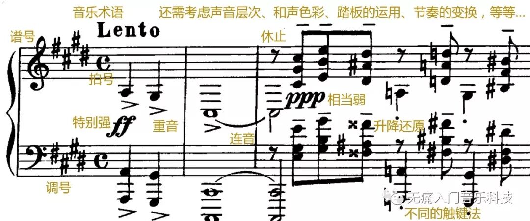 无论是哪一种音乐的表征形式,都会尽量涵盖音乐中的所有元素。比较直观的当属五线谱,随便拿出拉赫玛尼诺夫前奏曲开头的两小节看一下: