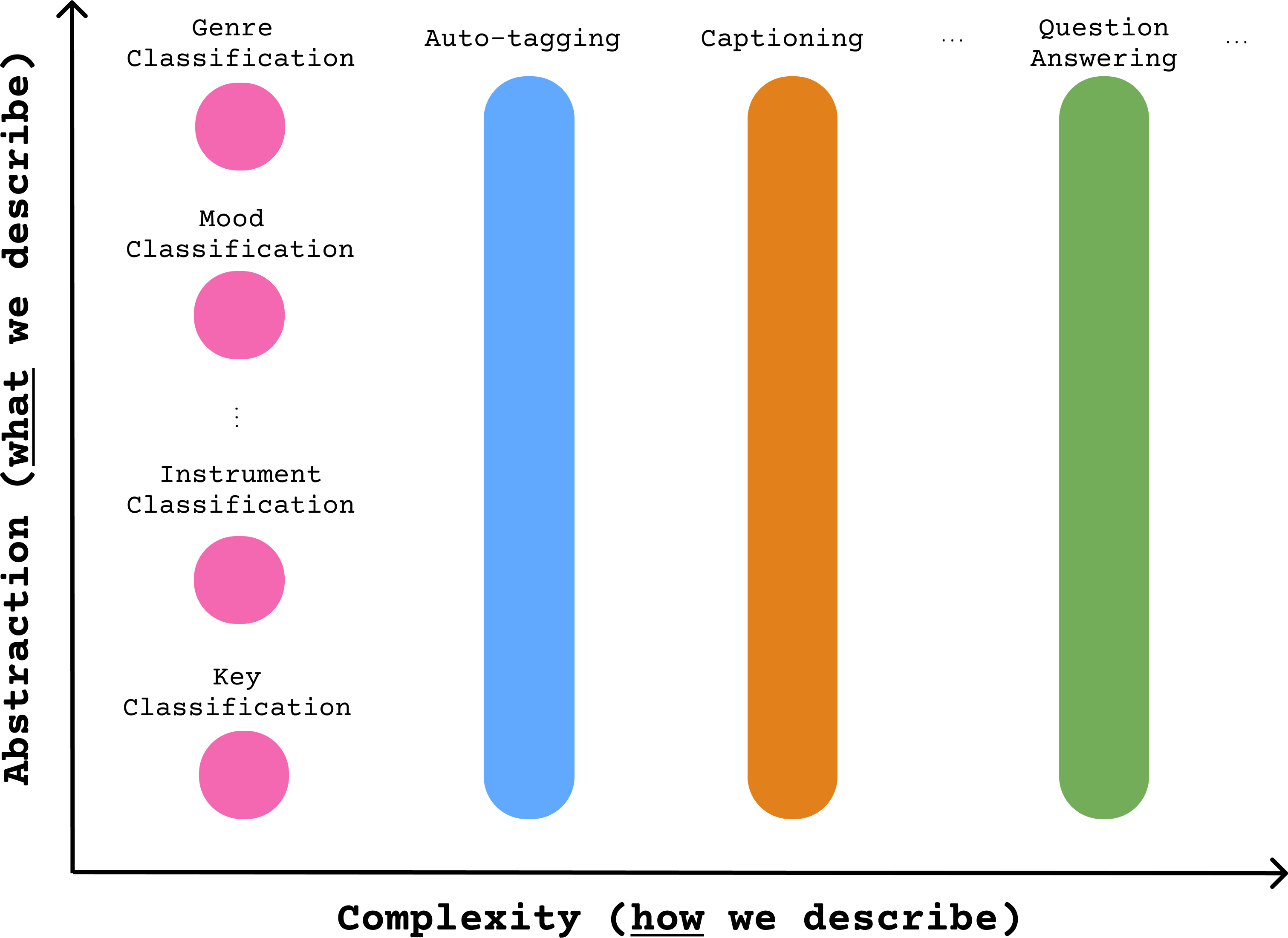 我们可以沿两个维度区分不同类型的音乐描述: