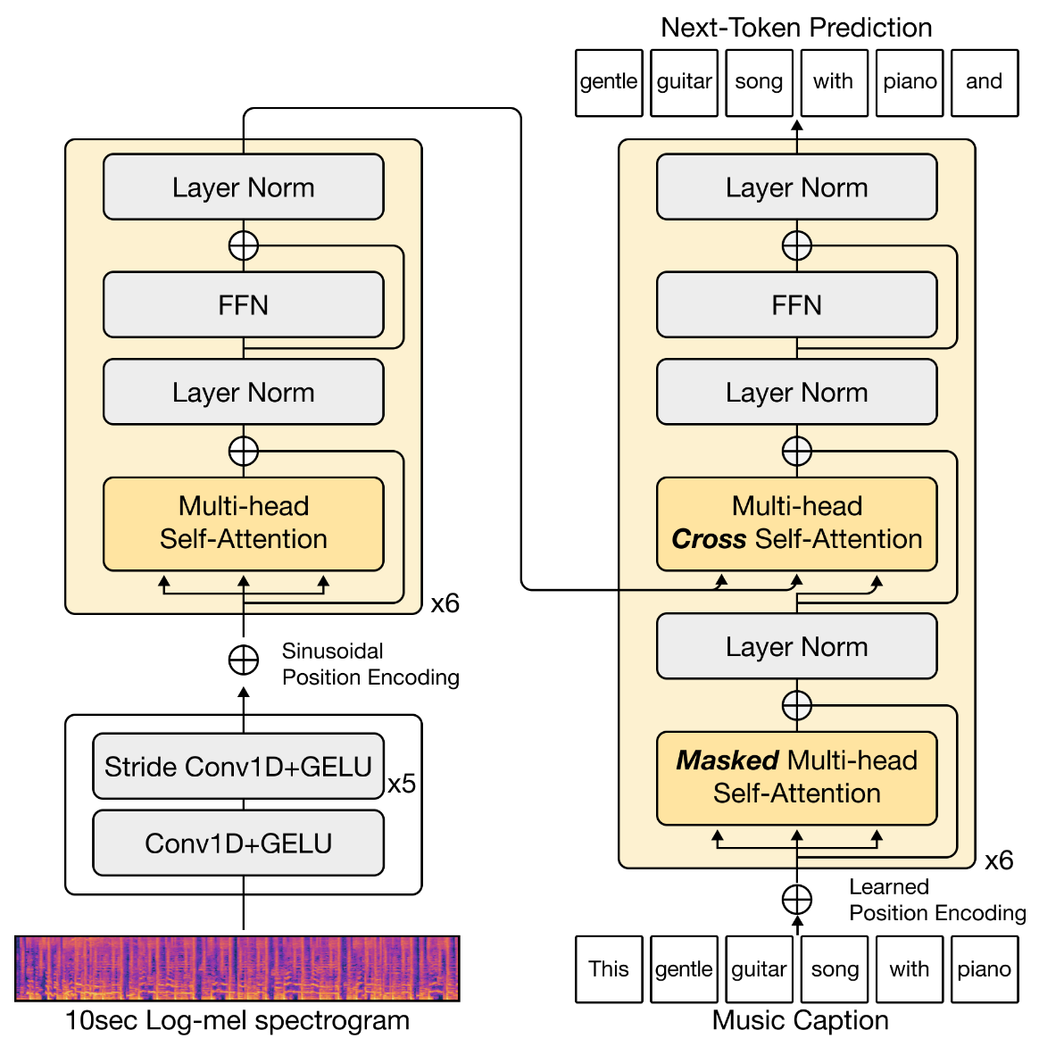 第一个 encoder-decoder 音乐描述模型出现在 Choi et al. [CFS16] 的工作中。虽然该模型尚未能生成格式良好的句子,但 Manco et al. 后来提出的 MusCaps [MBQF21] 巩固了类似架构在轨道级 music captioning 中的使用。这些早期的 encoder-decoder 音乐字幕生成模型采用基于 CNN 的音频编码器和基于 RNN 的语言解码器。该框架的更新迭代版本通常使用基于 Transformer 的语言解码器(例如基于 GPT-2 [GHE22] 或 BART [DCLN23] 等 Transformer decoder),搭配 CNN [GHE22] 或 Transformer 音频编码器 [SCDBK24],有时还结合两者 [DCLN23]。